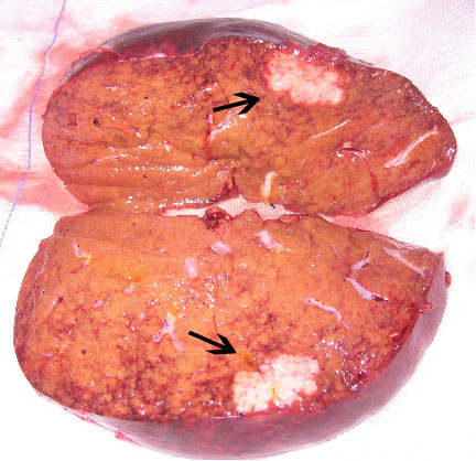 Εικόνα 1. Τυπική ηπατική μετάσταση μεγέθους 3,5 εκατοστών (σημειώνεται με μαύρα βέλη) σε οβελιαία τομή παρασκευάσματος δεξιού ηπατικού λοβού.