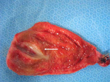 Εικόνα 1. Παρασκεύασμα χολοκυστεκτομής για μονήρη πολύποδα μεγέθους 2 cm σε γυναίκα ηλικίας 70 ετών. Με λευκό βέλος σημαίνεται το μόρφωμα, το οποίο αποδείχθηκε ότι ήταν αδενοκαρκίνωμα χοληδόχου κύστης (στάδιο pT1bN0M0).