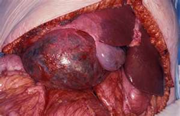 Εικόνα 1. Απλή μονήρης κύστη του δεξιού ηπατικού λοβού σε γυναίκα 58 ετών. Η ασθενής υποβλήθηκε σε απεικονιστικές εξετάσεις κοιλίας ύστερα από επεισόδιο έντονου πόνου στο δεξιό υποχόνδριο και σημαντικής πτώσης του αιματοκρίτη. Εγχειρητικά επιβεβαιώθηκε η διάγνωση της αυτόματης ενδοκυστικής αιμορραγίας.