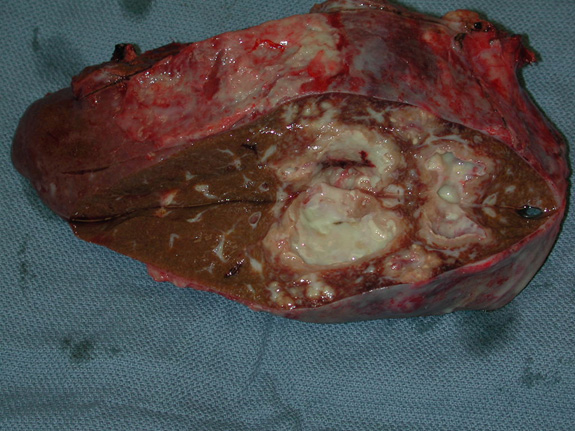 Εικόνα 1. Παρασκεύασμα δεξιάς ηπατεκτομής σε γυναίκα ασθενή 72 ετών με ευμέγεθες ηπατικό απόστημα στο δεξιό ημι-ήπαρ, το οποίο προκλήθηκε από υποκλινική σκωληκοειδίτιδα. Η φλεγμαίνουσα σκωληκοειδής απόφυση αφαιρέθηκε στον ίδιο χρόνο διενέργειας της ηπατεκτομής.