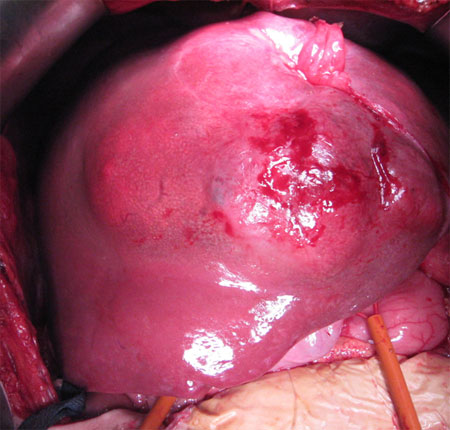 Εικόνα 1. Ευμεγέθης μετάσταση (12 εκατοστά) νευροενδοκρινικού όγκου του μέσου εντέρου (σκωλεικοειδής απόφυση) στα ηπατικά τμήματα IV, V και VIII.