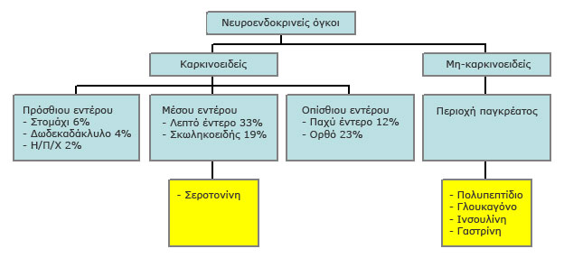 Οι νευροενδοκρινείς όγκοι (ΝΟ) διακρίνονται σε δύο μεγάλες κατηγορίες, τους καρκινοειδείς και τους μη-καρκινοειδείς (βλέπε διάγραμμα). Οι καρκινοειδείς (ΝΟ-Κ) με τη σειρά τους κατηγοριοποιούνται, ανάλογα με την εντόπισή τους, σε πρόσθιου εντέρου (στομάχι, δωδεκαδάκτυλο, ήπαρ, πάγκρεας, χοληφόρα, κτλ), σε μέσου εντέρου (λεπτό έντερο, σκωληκοειδής απόφυση) και σε οπίσθιου εντέρου (παχύ έντερο, ορθό). Από τη άλλη πλευρά, οι μη-καρκινοειδείς (ΝΟ-ΜΚ) εντοπίζονται συνήθως στην περιοχή του παγκρέατος.