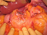 Πρόκειται για γυναίκα ασθενή 57 ετών, η οποία υποβλήθηκε σε γαστροσκόπηση για άτυπα γαστρεντερικά συμπτώματα. Διαπιστώθηκε επίπεδη βλάβη στην περιοχή του ελάσσονος τόξου στο σώμα του στομάχου. Από την ιστολογική εξέταση της συγκεκριμένης περιοχής διαπιστώθηκε γαστρικό αδενοκαρκίνωμα. Επιπλέον, η αξονική τομογραφία σταδιοποίησης ανέδειξε, στο 2ο ηπατικό τμήμα, ενδοπαρεγχυματική μονήρη μάζα μεγέθους 1 cm, παρακειμένως της γαστρικής βλάβης (εικόνα 1). Η ασθενής υποβλήθηκε σε υφολική γαστρεκτομή και σε en bloc εκτομή του 2ου ηπατικού τμήματος. Διενεργήθηκε λεμφαδενικός καθαρισμός (εικόνα 2) του τρίποδα του Haller (LNst 9), της αριστερής γαστρικής (LNst 7) και της ηπατικής αρτηρίας (LNst8). Επιπλέον, η άνω μεσο-εγκάρσια περιτονία (η καλύπτουσα την άνω παγκρεατική επιφάνεια) συμπεριλήφθηκε στο παρασκεύασμα (εκτομή D2). Πραγματοποιήθηκε εντερική αποκατάσταση κατά Billroth II (εικόνα 3). Η ασθενής έλαβε εξιτήριο τη 10η μετεγχειρητική ημέρα.