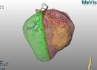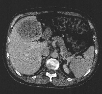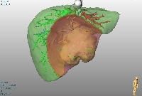 Πρόκειται για άνδρα ασθενή 44 ετών, ο οποίος υποβλήθηκε σε αξονική τομογραφία άνω κοιλίας στα πλαίσια διερεύνησης επιγαστραλγίας. Βρέθηκε μάζα στο 4ο, 5ο και 8ο ηπατικό τμήμα (εικόνα 1). Δε διαπιστώθηκαν σημεία κίρρωσης. Η διερεύνηση για πιθανή πρωτοπαθή εστία εκτός ήπατος ήταν αρνητική. Τέθηκε η διάγνωση της πρωτοπαθούς ηπατικής μάζας (HCC vs CCa). Η εικονική αριστερή εκτεταμμένη ηπατεκτομή με ανάλυση MEVIS (εικόνα 2) οδήγησε σε ηπατικό κολόβωμα μεγέθους 30% του αρχικού, ποσοστό που κρίθηκε ανεπαρκές. Η εικονική κεντρική ηπατεκτομή με ανάλυση MEVIS (εικόνα 3) οδήγησε σε ηπατικό κολόβωμα μεγέθους 65% του αρχικού, ποσοστό που κρίθηκε ικανοποιητικό. Για το λόγο αυτό, ο ασθενής υποβλήθηκε σε κεντρική (parenchymal sparing) ηπατεκτομή (εικόνα 4). Tο παρασκεύασμα αποτελούνταν από τα ηπατικά τμήματα 4b, 5, 8- και τη χοληδόχο κύστη (εικόνα 5). Η διατομή του (εικόνα 6) ανέδειξε μάζα μεγέθους 9 εκατοστών με κάψα, η οποία αφαιρέθηκε άθικτη. Τα ιστολογικά χαρακτηριστικά του όγκου (CK7+, CK19+, CK20-) ήταν συμβατά με CCa (mass forming). Ο ασθενής έλαβε εξιτήριο τη 10η μετεγχειρητική ημέρα.