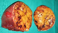 Πρόκειται για άνδρα ασθενή 73 ετών ο οποίος, στα πλαίσια διερεύνησης αισθήματος εύκολης κόπωσης, διαπιστώθηκε (MDCT, MRI) ότι έφερε ευμεγέθη, μονήρη, συμπαγή μάζα στο δεξιό λοβό του ήπατος, με μέγιστη διάμετρο 13 cm και απεικονιστικά χαρακτηριστικά αδενώματος (εικόνες 1 & 2) . Είχε ιστορικό συνεχούς κατανάλωσης αλκοοόλ με ήπια διαταραγμένη ηπατική βιοχημεία. Υποβλήθηκε σε δεξιά ηπατεκτομή (σωστική παρεγχύματος, parenchymal sparing) με τη χρήση της τεχνικής επικρεμμάμενου ήπατος (hanging maneuver, εικόνα 3). H παθολογοανατομική εκτίμηση του παρασκευάσματος (εικόνες 4 & 5) επιβεβαίωσαν την αρχική διάγνωση. Ο μετεγχειρητικός σχετικός όγκος του ηπατικού υπολείμματος (εικόνα 6) ανήλθε στο 72% του αρχικού όγκου του οργάνου. Ο ασθενής έλαβε εξιτήριο την 6η μετεγχειρητική ημέρα.