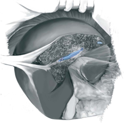 Κινητοποίηση της αριστερής πλευράς του ήπατος με διατομή των αντίστοιχων συνδέσμων (δρεπανοειδής, στεφανιαίος, τρίγωνος).