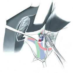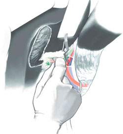Εξωηπατική ανεύρεση και διαίρεση της αριστερής ηπατικής αρτηρίας (προσαγωγό αγγείο).