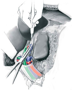 Διάνοιξη της περιτοναϊκής επικάλυψης του ηπατοδωδεκαδακτυλικού συνδέσμου (ηπατικές πύλες). Διαίρεση του ελάσσονος επιπλόου. Διενέργεια χολοκυστεκτομής.