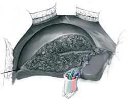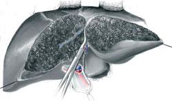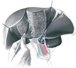 Κινητοποίηση της αριστερής πλευράς του ήπατος με διατομή των αντίστοιχων συνδέσμων (δρεπανοειδής, στεφανιαίος, τρίγωνος).