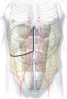 Διενέγεια εγχειρητικής τομής τύπου εκτεταμμένης Kocher με επέκταση στη μέση γραμμή.