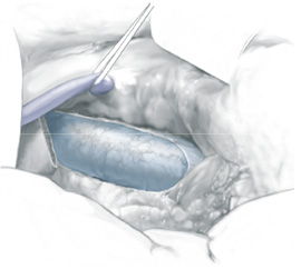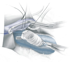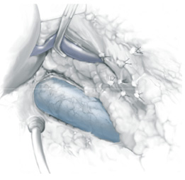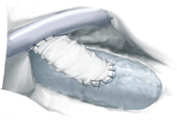 Χρήση μοσχεύματος PTFE 8 mm, ενισχυμένου με δακτυλίους, μήκους 3 cm. Αναστόμωση του μοσχεύματος με την υφηπατική κάτω κοίλη φλέβα.